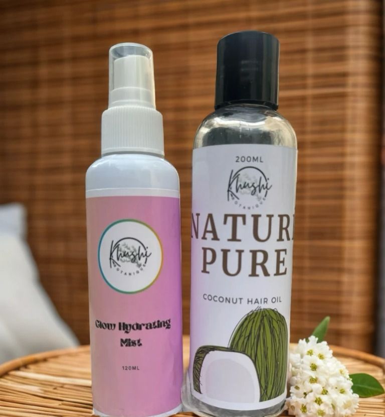 Two essentials. Endless benefits. The Hydrate & Nourish Duo combines the lightweight freshness of our Glow Hydrating Mist with the deep restorative power of our Nature Pure Coconut Hair Oil — giving your skin and hair the daily love they deserve.